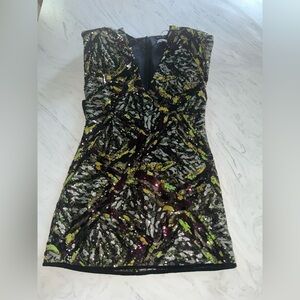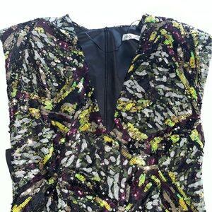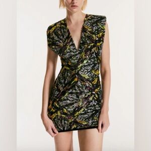 Stunning Zara dress with abstract pattern. Features deep V-neckline. Perfect for prom or special occasions.