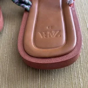 Vibrant sandals with braided straps. Features orange, white, black, and green accents.