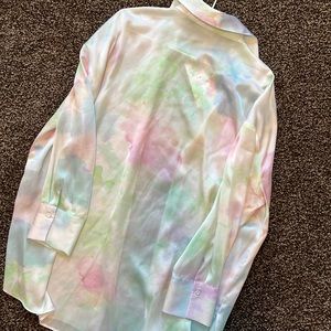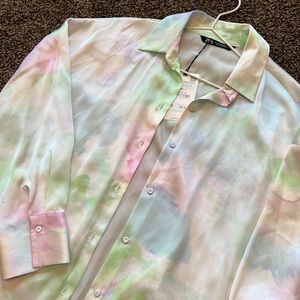 Stylish button-down shirt. Features a blend of pastel colors. Perfect for casual wear.