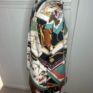 Bloggers favorite New without tag. Size S. Elegant blouse with chain and floral print. Features multicolor design with teal, black, white, and gold accents. Smoke free home