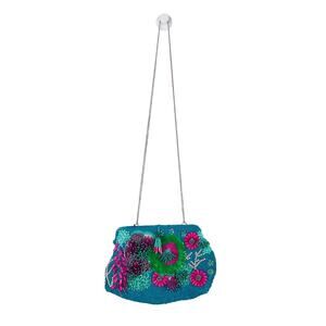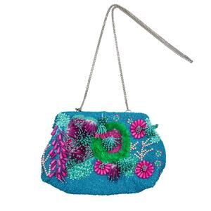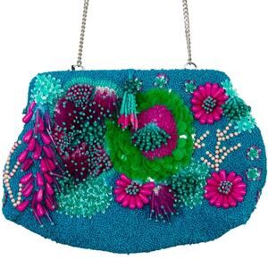 Zara Blogger Favorite Multicolor Beaded Floral Crossbody Bag. Teal Blue Beaded Clutch bag with Magenta Pink, Purple, and Green Sequin and Beaded Embellished Bag. 3D Embellished Bag with Tassel Beads & Silver Chain Crossbody Strap.