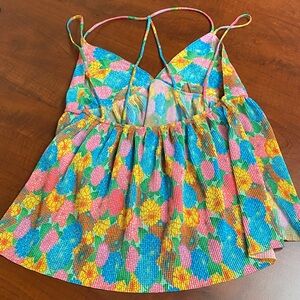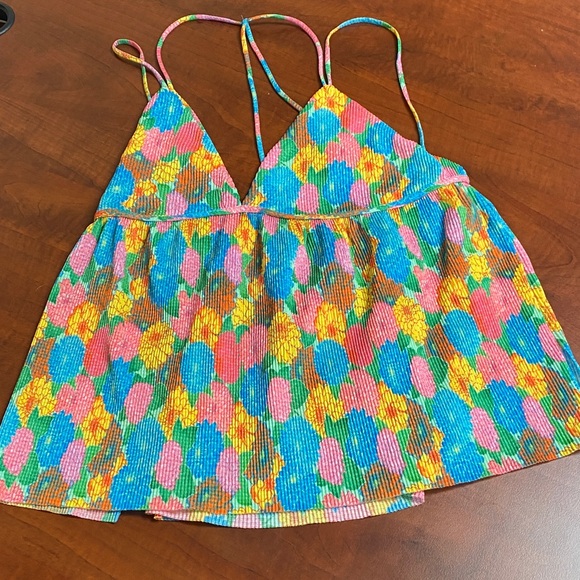 Lightweight ribbed tank with bright floral print. Spaghetti straps and a relaxed, flared silhouette. Bold blue, pink, yellow and green blooms for a playful look. Perfect summer top! Great condition, maybe worn once if at all.