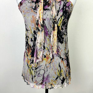 Stylish halter blouse with abstract print. Features a mix of black, purple, and cream colors. Perfect for a chic look.