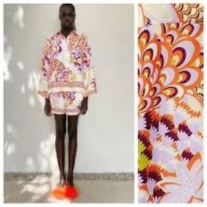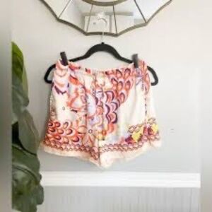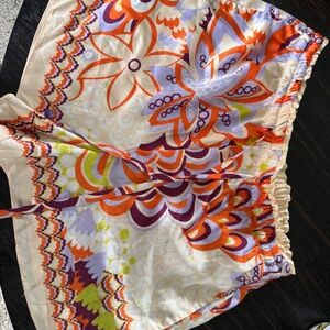Vibrant high waist shorts with a drawstring. Features a bold multicolor pattern. Perfect for a stylish look.