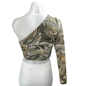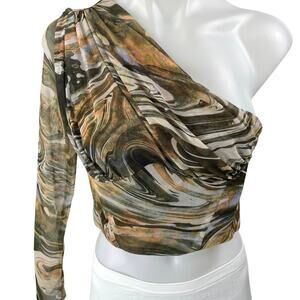 Zara Multicolor Marble Print Tulle One Shoulder Long Sleeve Crop Blouse Top Sz S