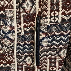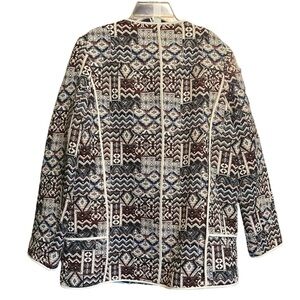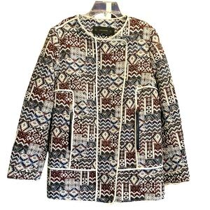 Stylish Zara blazer with intricate patterns. Features a mix of colors. Perfect for a chic look.