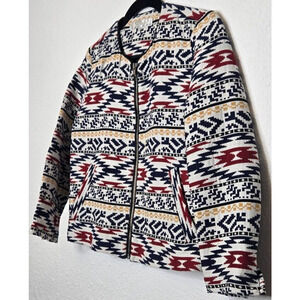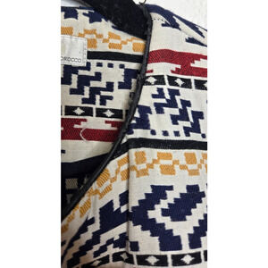 Stylish Zara blazer with geometric patterns. Features red, black, and gold accents. Perfect for a chic look.