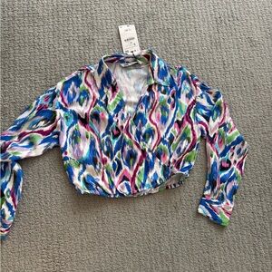 Vibrant crop top with a bold pattern. Features a deep V-neck and long sleeves. Perfect for a stylish look.