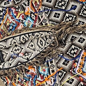 Vibrant multicolor design. Intricate patterns. Fringe detailing. Perfect for a bold statement.