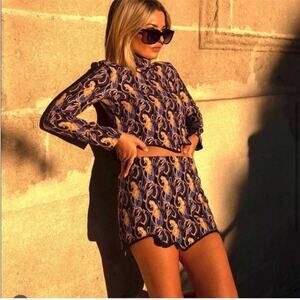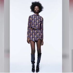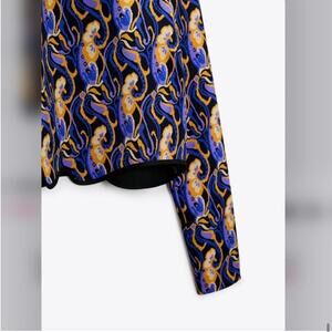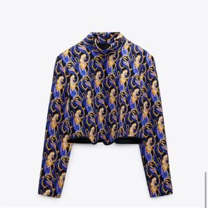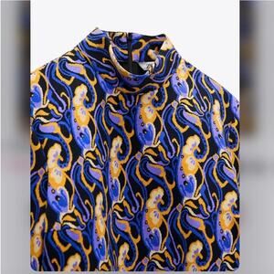 Stylish long-sleeve top with vibrant pattern. High neckline. Perfect for a chic look.