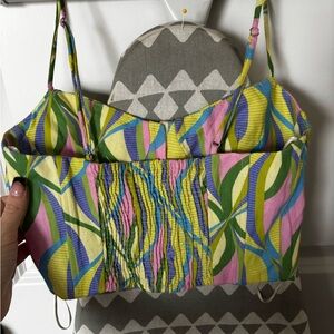 Vibrant multicolor design. Features yellow, pink, blue, and green patterns. Stylish and unique. Cute little spaghetti straps