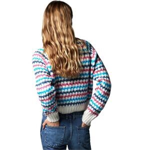 Pre-loved, excellent condition Zara multicolor rainbow stripe knit sweater. Features a cozy crew neckline, ribbed trim, and a soft oversized fit. Vibrant red, blue, pink, and white stripes give it that fun, cheerful winter vibe. Extremely soft and comfortable — perfect for layering over jeans or leggings for a bright and cozy cold-weather look.