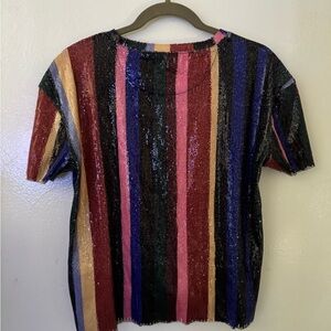 Vibrant multicolor striped top with sequins. Features shades of pink, blue, and black.