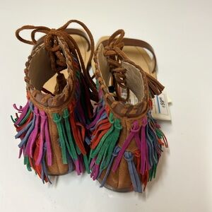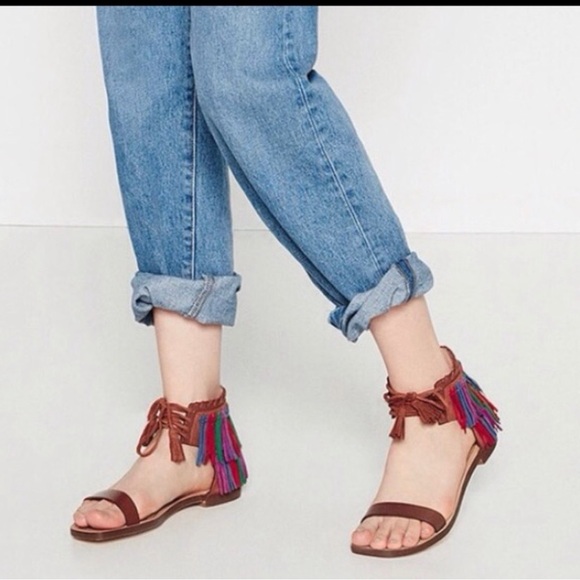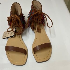 Zara Multicolored Fringe Brown Leather Sandals Size 6.5. NWT