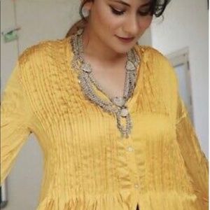 🌞Mustard Full cut midi dress with V-neck and long sleeves. Wrinkled effect fabric. Pleated detail. Asymmetrical hem. Front button closure.