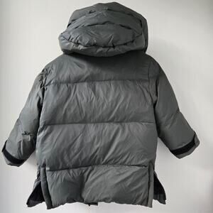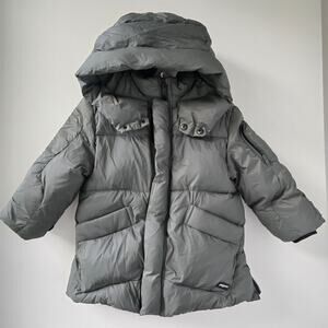 Zara Kids feather down puffer parka coat hooded coat in olive green gray color. Lightweight, lofty and warm with oversized, non-removeable hood, soft brown faux fur lining, 5 pockets, front zipper closure, long sleeves with elasticized cuffs.