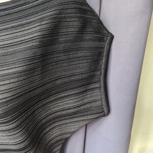 This dress is new with tags. It is a stretchy textured material. The collar is a wide boat style. The sleeves are asymmetrical and different lengths. The waist is fitted. It is a pull on style. Please see photos for details.