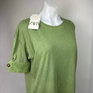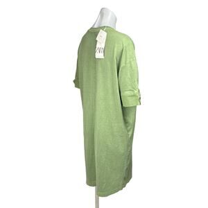 Zara NWT Green 100% Cotton Cuffed Short Sleeve Crew Neck Oversized Casual Travel Summer T-Shirt Midi Dress Size S