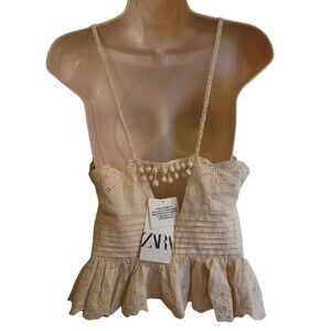 Zara NWT Ivory/Beige Crochet Embroidered Peplum Crop Top Size Small 100% Cotton