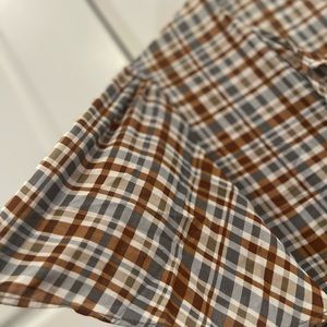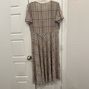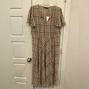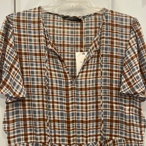 NWT Zara Premium Denim Collections The Long Check Dress Woman’s Plaid Brown/Creme/Gray Dress has butterfly sleeves. V-Neckline with ties and it is a pullover. Fabric is sheer throughout. (Would need an under slip).Dress is perfect for Business Attire, Spring and Summer Outings. Feminine and Flowy!