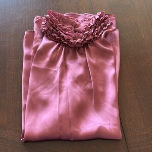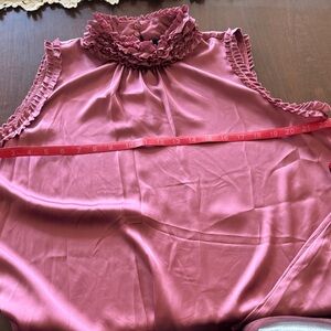 Chic pink blouse with ruffled neck. Sleeveless design. Soft and stylish.