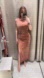 Sleeveless dress with golden appliqué at shoulder. Ruching detail and slit hem. Hidden zip closure at side.