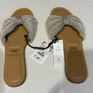 Zara NWT tan/Off-white and Black Striped Bow women’s flat Sandals - size EU 39
