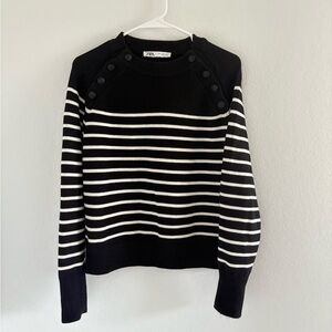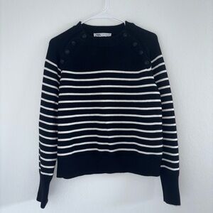 Zara Nautical Striped Knit Pullover Sweater Black White Anchor Buttons Medium