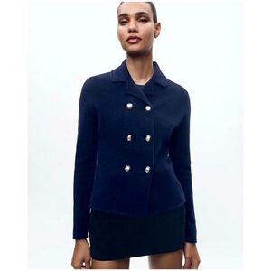 Chic navy blazer sweater jacket featuring gold buttons. Perfect for a polished look. Brand new without tag. A Bloggers Favorite!!
