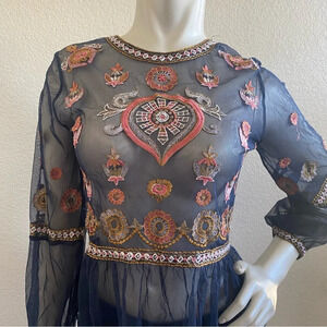 Zara Navy Blue Embroidered Long Sleeve Boho Top Size Small