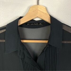 Zara Navy Blue Pleated Tuxedo Front Chiffon Long Sleeve Button Down XS