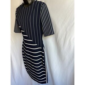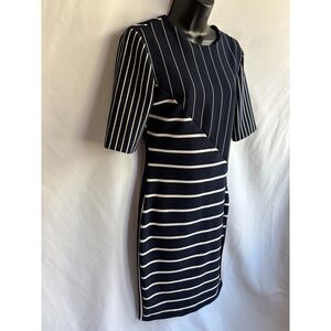 Zara Navy Blue Striped Asymmetrical Midi Bodycon Sheath Dress Classy Cocktail M
