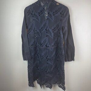 Zara Navy Linen Crochet Leaf Fern Eyelet Lace Tunic Size S