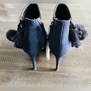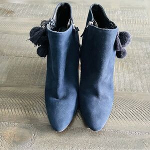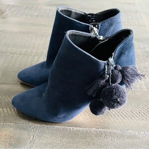 Zara Navy Suede Pom Pom Heeled Chic Minimalist Booties Women’s Size 9.5