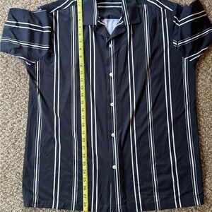Chic navy shirt with white stripes. Ideal for casual summer wear. Modern and comfortable.