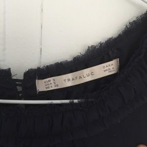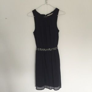 Zara navy dress, silky texture, cinched waist with sequin detailing. Classic and wearable.