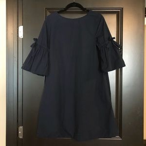 Easy throw on dress. Round neck dress with ruffled sleeves that fall below elbow. Classic bow detail on sleeves. Vneck back with fabric tie. Pockets hidden in side seam. Never worn with tags. 100% cotton