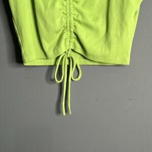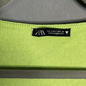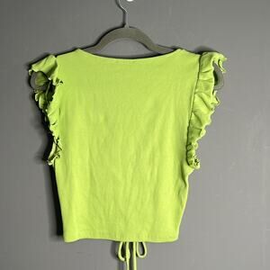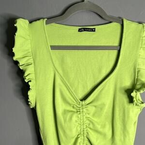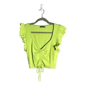 Zara Neon Green Ribbed Cinched Crop Top Ruffle Short Sleeves Size Large