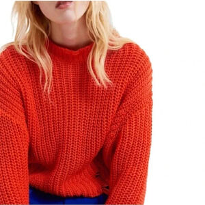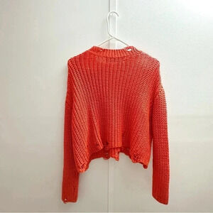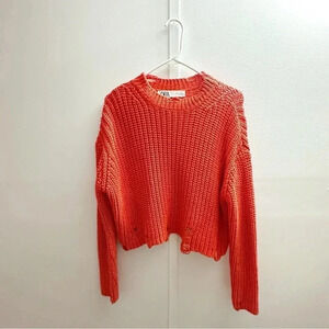 Zara Neon Orange Red Chunky Knit Distressed Cropped Crewneck Sweater Size Small