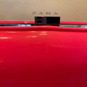 Bold neon pink clutch with a sleek design. Includes a long strap (removable) to change it from an evening clutch to everyday crossbody. Features a glossy finish, snap clutch closure, and an inside mini pocket and black interior. Such a unique mini handbag. Perfect way to add a pop of color to any outfit. Small black mark on the back of the bag. Barely noticeable and was delivered that way when ordered. (See last photo).