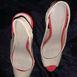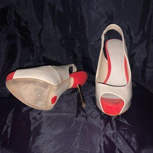 Neutral patent leather upper, peep-toe platform sling backs. Beautiful red suede accent at toe and back heel.