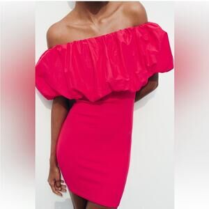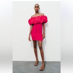 Fitted dress with straight neck, exposed shoulders, and short sleeves. Combination voluminous tonal poplin fabric.
