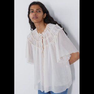 Semi-sheer top with round neck and front tie closure. Super cute top to pair with jeans or leather black pants.