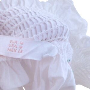 with embroidered flowers all over, puffed sleeves, Ruffles On the shoulders, smocked details
