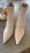 Chic cream booties with sleek design. Perfect for versatile styling. Features a pointed toe, side zipper and gold heels