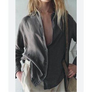 This Zara button down shirt in a chic olive green color offers a relaxed fit and a contemporary mandarin collar. Crafted from soft fabric, it provides comfort and style for a casual, effortless look.