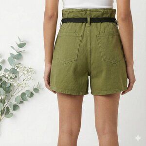 These trendy high-waisted shorts from Zara feature a flattering paperbag waist design that cinches the silhouette, complete with an included black braided belt. They showcase a stylish exposed button-fly closure with silver hardware and deep front and back pockets. The olive green color gives them a chic utility or safari-inspired vibe, perfect for warm-weather outfits.
