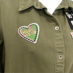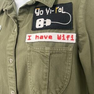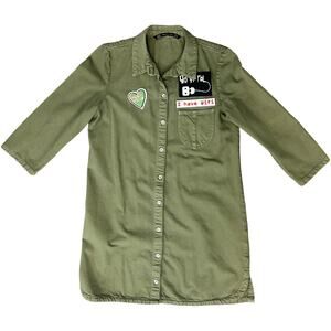 Zara Trafaluc Denimwear shirt dress in olive green cotton with fun embroidered patches reading “Hook Me Up,” “Go Viral,” and “I Have Wifi.” Features a collared neckline, single chest pocket, 3/4 sleeves, and button-down front. Includes extra button on the care tag. Can also be worn as a tunic.