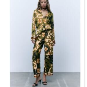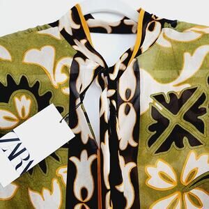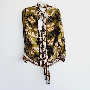 Zara Olive Green Printed Long Sleeve Top Neck Tie with Beading Size Small
