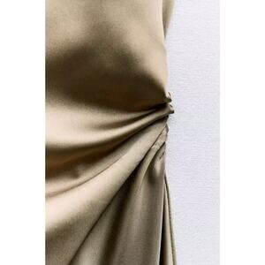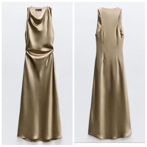Elegant satin maxi dress. Sleeveless with a draped neckline. Perfect for evening wear.